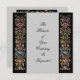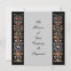 Arte vítrea de um manuscrito iluminado antigo com flores coloridas e folhas de rolagem em preto e cinza.