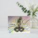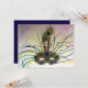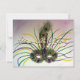 Pintura em aquarela com leves toques de pastel de uma máscara de Mardi Gras emplumada. Utiliza as cores tradicionais do Mardi Gras: roxo, verde e dourado. Duas penas de pavão coroam a máscara. A frente do cartão de convite observa "Mardi Gras". O verso dos cartões de convite tem "Laissez les bon temps rouler!" como uma saudação e espaço para você adicionar os detalhes personalizados do convite para sua festa de carnaval personalizada. Todas as palavras no cartão podem ser personalizadas, conforme necessário.