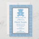 Hospedando um chá de fraldas para uma nova mãe que está esperando um bebê? Envie seus convites para o Chá Personalizado do Urso Xadrez Azul, o Bear Boy, convida a apresentar um padrão de xadrez azul e uma ilustração fofinha do ursinho. Pronto para personalizar com o nome da Mãe e as informações do chá de fraldas.