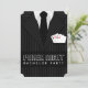 © Sunny Mars Designs - Terno Listrado: Convites de festa de solteiro em forma de bilhete de pôquer - Convite personalizável para festa de cassino à noite em Las Vegas ou noite de pôquer de solteiro com terno ou smoking listrado preto e cinza, gravata preta e camisa branca com um conjunto de quatro ases saindo do bolso. Personalize-o adicionando seu próprio nome e detalhes. Você pode alterar a fonte e o tamanho do texto clicando no botão 'personalizar'.