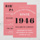 For those born in 1946 and celebrating their birthday party we have the ideal birthday invitation card. The pink background with a white and black design is simple and yet elegant. Easily customize the text to the front and the rear of this birthday invitation card using the template provided. Part of the setting standards range of cards, party supplies and gifts.