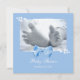 Um convite elegante do chá de fraldas do menino com uma fotografia dos pés recém-nascidos do bebê ainda que vestem suas bandas do hospital, quadro contra um fundo azul pastel e embellished com as folhas filigranas clássicas e uma fita de azuis bebés preciosa amarrada em um arco. Imagem impressa do plano, fita nao real.