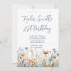 Um moderno azul empoeirado e cor d'água cor de pêssego flores silvestres da arte digital, aniversário de 21 anos 5x7, convite para ela. Você pode personalizar o tamanho da fonte, os estilos e as cores neste design. Há muitos estilos de caligrafia adoráveis.