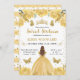 Elegante cor d'água, princesa vermelha cabelada em design de vestido amarelo com flores amarelas e douradas, borboletas e confete dourado.