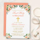 A Elegante Aquarela Peach White Floral Primeiro Convite à Santa Comunhão inclui rosas de pêssego, flores brancas e verde. Dourada Cruz.