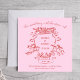 Estes convites para casamento, cor-de-rosa e vermelha apresentam uma ilustração desenhada à mão de uma crista de casamento com cherubs e flores. A hora do casamento vai para uma fita de na moda. Há um roteiro manuscrito para um olhar viscoso e romântico.