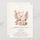 Hora de abrir o prosecco! Bonito convite para chá de festas de chá de noiva com as pétalas e prosecco que dizem que tem pequenos corações nos glifos. O copo está cercado por bonito flores rosa. O fundo é uma bela sombra cremosa que acrescenta ao aspecto moderno. Que design na moda para o seu chá de panela! Veja a coordenação de itens no nosso compro, Encantado Finch.