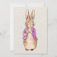Peter o coelho numa jaqueta rosa com um fundo tecido de roupa bege.