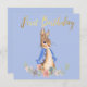 Peter the Rabbit em um Fundo Azul com texto de "Primeiro aniversário" dourado.
