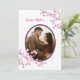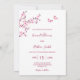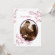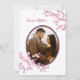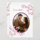 This elegant wedding invitation features a round photo surrounded by pink cherry blossom branches on a white background. Bride and groom names in an elegant handwritten script.