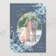 Photo Dusty Blue Script Elegant Floral Wedding Invitation. Announce your upcoming wedding with this elegant dusty blue floral photo save the date card. The design features a beautiful arrangement of blue roses and greenery framing a space for your favorite engagement photo. This save the date card is perfect for couples seeking a romantic and timeless feel for their wedding stationery. The soft blue hues and delicate floral accents create a sophisticated atmosphere, setting the tone for your special day. Make your announcement unforgettable with this charming photo save the date card.