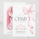 Celebrate your graduation in style with this photo pink bow graduation ainvitation. The design features a beautiful watercolor pink bow with flowing ribbons, perfectly complementing the modern script text that announces the graduate's name and party details. This invitation is ideal for a high school or college graduation party, adding a touch of sophistication and charm to your special event. Make your graduation celebration unforgettable with this unique and stylish invitation.
