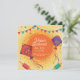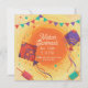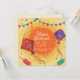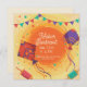 Convite para comemoração de Makar Sankranti. Fundo amarelo festivo com bandeiras e confete com pipas vermelhas e roxas.