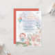 Um piquenique de Chá de fraldas de pipa de macaco giro definindo a cena para seu piquenique com esse macaco doce com sua cesta, xícara e bolo, com belos florais e pipa voadora. O Chá de fraldas de cabeçalho está em um script elegante definido e o resto do texto que você pode personalizar facilmente. Um fundo de coral coordenado está atrás.
