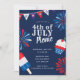 Fogo Patriótico Convite piquenique de 4 de julho com fundo azul escuro.