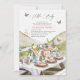 Tendo um chá de fraldas de verão? Esse convite encantador e piquenique com ilustração aquática de uma mesa elegante rústica em cor rosa e azul de pêssego, com algumas borboletas, é perfeito para uma festa neutra no jardim do chá de fraldas ou um piquenique elegante no chá de fraldas.