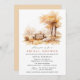 Convites de chá de panela com tema de outono com uma ilustração cênica de aquarela de uma mesa piquenique sob árvores laranja. Design de inspiração rustica com sotaques formais de guião. O texto do evento pode ser alterado ( para "brunch bridal", ex. O texto do script não é editável). O lado inverso é uma cor bege quente. (As cores podem ser alteradas, se desejado, usando a ferramenta design).