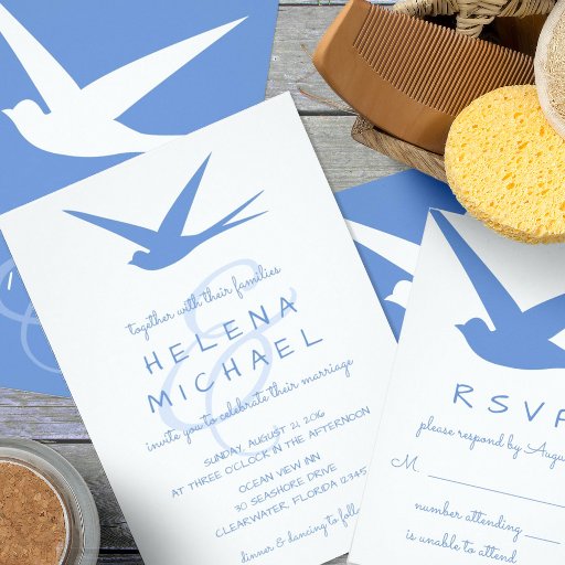 Cartão de convite azul e branco elegante para celebrar a promoção de um piloto de linha aérea ou de um novo formando da escola de voo. Engole branca contra um céu azul. Todos os textos são totalmente personalizáveis.