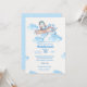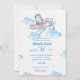 Convite Piloto Pinguim Azul Cóteo de Aquarela com fundo texturado, nuvens azuis. O fundo tem estrelas brancas sobre fundo azul. Mamãe vai adorar esse chá de fraldas de garotos alegres.