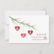 Um convite de casamento com uma ilustração de três corações vermelhos pendurados num ramo de pinheiro. Personalize com as suas iniciais no coração. Personalize o texto na frente e no verso.
