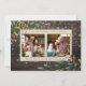 Este cartão com fotos de férias é perfeito para qualquer família. Este design apresenta um lindo fundo de madeira russa escuro com uma delicada camada de floco de neve. Nos cantos superior esquerdo e inferior direito encontram-se alguns pergaminhos festivos pintados à mão com pínus cones e bagas. No centro do cartão estão 2 fotos quadradas com delicadas bordas de folha de ouro com "desejamos-lhe um Feliz Natal" acima e "com amor", e então seu nome de família, abaixo das fotos.