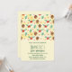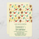 Convite de aniversário com um padrão fofo com cones de pínus e holly em um fundo de aquarela amarela com pequenos círculos brancos espalhados ao redor.