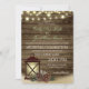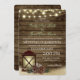 Lanterna russa e pinecones, lenha de lenha e lanternas convite de casamento com efeito brilho luzes de design sobre velhas planilhas de madeira de celeiro.