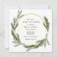 O convite para o chá de aspersão para bebês com o tema Elegante Winter apresenta um quadro dourado rodeado por cor d'água evergreen e pine. Personalize com suas informações ou clique em "Clique para personalizar mais" para editar estilos de fonte, tamanho e cores.