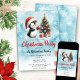Crie Convites de festas de Natal bonitos com um pinguim alegre em um chapéu vermelho de Papai Noel decorando uma árvore de Natal. Estes convites de Natal modernos são desenhados com um fundo azul de neve com flocos de neve elegantes. O modelo facilita a personalização do texto para o nome da família, data e hora, endereço, RSVP e código de vestimenta da festa.