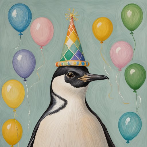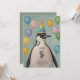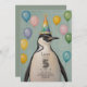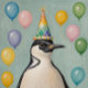 Pinguim com chapéu de festa e balões em cores pastéis, perfeito para as suas celebrações de aniversário