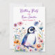 Um pinguim giro rodeado por flores cor-de-água, rosa, azuis, laranja e roxo ilustrando convites de festas de aniversários femininos.