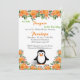 Celebre a chegada iminente do pequeno pinguim com uma elegante decoração de chá de bebê temática de pinguim e lindas flores. O design apresenta um pequeno pinguim preto e laranja e flores em aquarela que têm flores laranja e rosa e folhas verde-escuras. Você pode clicar no botão personalizar para modificar este modelo. Além disso, você pode optar por alterar o tipo de papel se desejar.