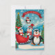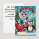 Este cartão de Natal branco apresenta uma alegre cena de inverno onde pinguins adoráveis estão celebrando a temporada de festas. Um trenó vermelho brilhante está estacionado perto, cheio de presentes alegres. O cartão é acentuado com uma tipografia brincalhona que diz, "Desejando a você uma Feliz e Feriado Brilhante!" em letras elegantes, acrescentando ao charme festivo.