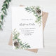 Fundo branco, decorado com cones de pinheiros, bagas brancas, folhas verdes. Personalize e adicione os detalhes da sua festa. Letras negras.