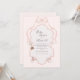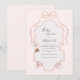 Beautiful pink watercolor ribbon frame surrounding lovely fonts and scripts done in coordinating colors baby shower invite. Ballerina tutu, slippers and other sweet girly whimsical accents coordinated pink pastel background. A perfect baby shower invitation for any season.