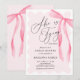 Nosso convite de chá de lingerie moderno com tema "She is Tying the Knot" com um laço de água-forte cor de rosa e uma moldura rendilhada suave sobre um fundo branco. Grafia bonita e elegante com a frase "She is tying the knot" combinada com tipografia elegante para os detalhes. Convite de chá de noiva com tema de laço coquete e moderno.