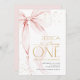 Pink bow girl's 1st birthday invitation. Modern feminine design in blush pink and gold. Features trendy watercolor coquette bow, calligraphy heart script font and modern typography ONE. Perfect for an elegant style girl's first bday celebration. Personalize with your own details. Printed Zazzle invitations or instant download digital printable template.