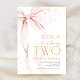 Pink bow girl's 2nd birthday invitation. Modern feminine design in blush pink and gold. Features trendy watercolor coquette bow, calligraphy heart script font and modern typography TWO. Perfect for an elegant style girl's second bday celebration. Personalize with your own details. Printed Zazzle invitations or instant download digital printable template.