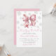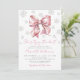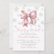 This elegant and cute pink bow theme features an adorable blush pink watercolor bow at the top with "She's tying the knot!" in pink and gray text throughout the invite. Light gray watercolor snowflakes gently fall from the top, reaching about halfway down the design for a soft and wintry touch. The invitation has a simple and minimal classic look, with a mix of serif font and script calligraphy typography.