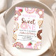 Pink Brown Sweet One Rosquinha Birthday Invitation Girl's sweets ou rosquinha temed first aniversation convidado apresentando várias rosquinhas e alguns cupcakes principalmente em rosa e marrom. Este doce convite de um aniversário é ideal para uma rosquinha ou doce a primeira festa de aniversário para uma menina.