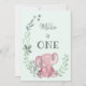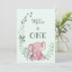 Pink Elephant with Floral Design First Birthday Invitation with customizable background color and text.