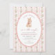 Celebrate your little bunny with this sweet baby shower invitation featuring soft pink stripes, vintage roses, and an adorable watercolor bunny illustration.