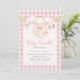 Celebrate a sweet and meaningful gathering with this elegant Baby Sprinkle Invitation, featuring a delicate daisy clothesline with baby dress, bonnet, and shoes, framed by a soft pink gingham background and charming ribbon details.