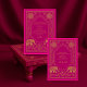 This vibrant oriental wedding invitation features an ornate gold-embossed frame on a striking pink background, perfect for a Hindu wedding celebration. Intricate mandalas, majestic elephants, and floral wine patterns highlight the indian cultural richness and festive spirit of the occasion.