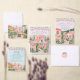 This destination wedding invitation features painted artwork of a Mexican desert beach scene. All the important wedding details can be personalized. Colors include green, pink, white and coral. Text in green.