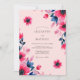 This design features vibrant watercolor poppies and anemones in shades of pink, magenta, and navy blue against a soft blush backdrop. The artistic brushstrokes create a romantic and modern feel, perfect for a seasonal spring or summer event. The deep indigo leaves provide a striking contrast to the bright floral blooms.