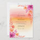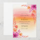 This design features a vibrant watercolor wash background reminiscent of a warm sunset, transitioning from soft peach to bright yellow. Delicate magenta hibiscus and orange blossoms adorn the edges, accented by slender painterly leaves. The artistic style creates a romantic and warm atmosphere perfect for a seasonal destination event.