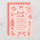 Featuring hand-drawn holiday icons — Santa, champagne glasses, candy canes, and more — in cheerful coral pink tones, this invitation sets the perfect mood for your Christmas or New Year’s bash.