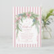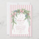 A soft pastel Christmas invitation featuring watercolor pine branches, pinecones, and pink satin bows on a blush striped background. This delicate design blends vintage charm with modern elegance — perfect for cozy holiday gatherings or feminine festive celebrations.