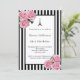 Classic slim black and white stripes as background. With romantic pink roses, and the the Eiffel Tower as decoration. A black and white frame with templates for your party information.